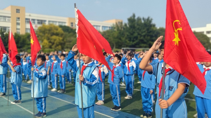 随着主持人韦林依依的登场,少先队出队旗,队员们队列整齐,精神饱满;旗手英姿飒爽,军姿端庄;鲜艳的五星红旗冉冉升起在校园上空。全体队员们带着对祖国的崇敬和祝福,高唱中华人民共和国国歌和《中国少年先锋队队歌》。