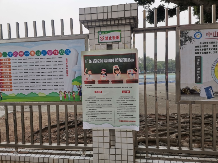 据了解,为了认真贯彻落实中山市教育和体育局关于落实“双减”政策温馨提示的通知精神,四沙小学一方面通过学期结业典礼由欧慧芳校长带领师生家长学习《关于落实“双减”政策的温馨提示》,还通过印发《温馨提示》要求学生带回家中让家长阅知。另一方面,学校还在校门口的显著位置张贴《广东省校外培训风险防范提示》海报广而告之。为使家长们能随时随地阅读《温馨提示》,学校还通过微信群向家长推送。