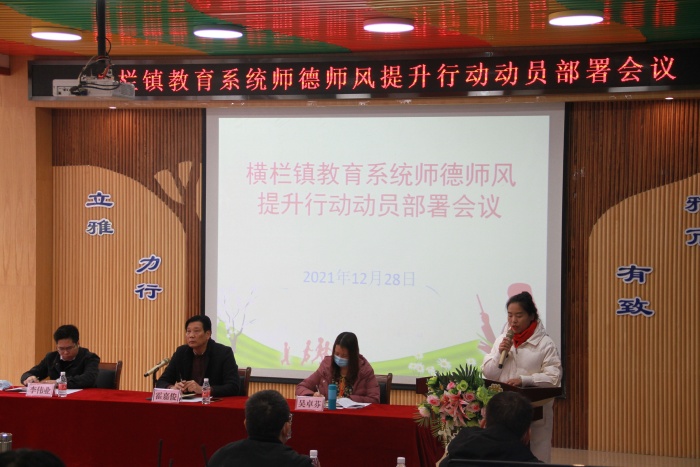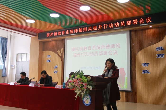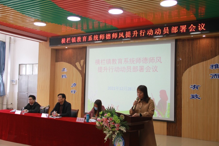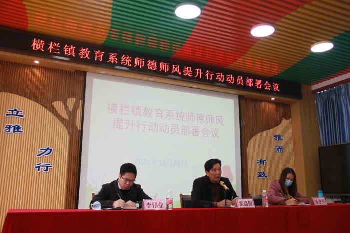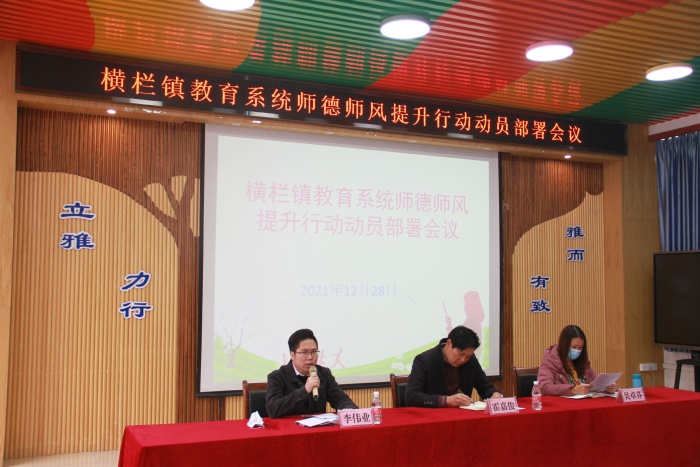 为贯彻落实《教育部等七部门印发<关于加强和改进新时代 师德师风建设的意见>的通知》(教师[2019]10号)、《中山市教育和体育局关于印发<中山市师德师风建设三年行动计划(2021-2023)>的通知》(中教体通[2021]168号)等的文件精神,进一步规范横栏镇中小学(幼儿园)教师职业行为,提高教师思想政治素质和职业道德水平,促进学生健康全面发展,2021年12月28日上午,横栏镇教育系统组织中小学校长和幼儿园园长在四沙小学召开了师德师风提升行动动员部署会议。横栏镇教育系统党委书记、横栏镇教育和体育事务中心主任霍嘉俊主持会议并对师德师风建设提出了要求。横栏镇教育和体育事务中心政工专干李伟业解读了《横栏镇教育系统师德师风提升行动方案》。中小学校校长和幼儿园园长代表作了表态发言。横栏镇教育和体育事务中心党支部书记、横栏镇教育和体育事务中心副主任吴卓芬出席了会议。