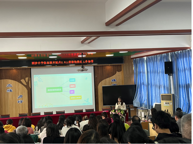 2021年12月6日中午,四沙小学在阶梯室召开了信息技术提升2.0工程整校推进工作部署会议,英语科组长程丽雅以《共研共享共成长,奋力提升正当时》为题作了关于典型案例建设的思考分享,教导主任梁洪华对学校信息技术提升2.0工程整校推进工作进行了部署。
