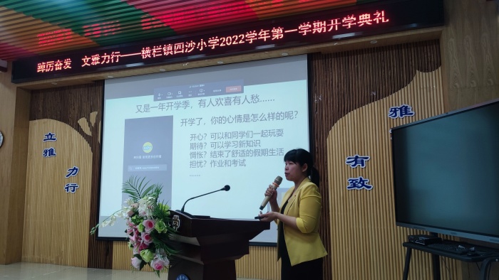 伴随着雄壮的国歌声,五星红旗冉冉升起,全体师生庄严肃立,仪式拉开了序幕。开学典礼上,法制副校长冼桂民通过引入实际案例和法律法规讲解给师生们做了深入浅出的法制宣传教育,引导学生们从小树立法制安全意识,自觉遵守纪律,不扰乱公共秩序,做个合格的公民。四沙小学德育处副主任卢玉冰给师生们带来了开学心理调适指南——《心适应 新启航》。卢玉冰建议师生们运用SMART法则,学会积极调整情绪,学会相信自己,迎接新学期的挑战。