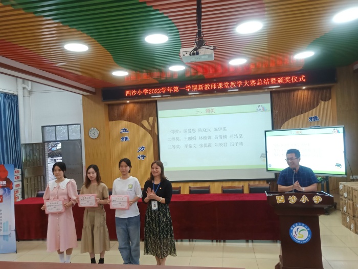 2022年11月14日,四沙小学2022年新进教师课堂教学大赛揭晓:区曼恩、陈晓岚和陈伊柔三位老师荣获一等奖;王丽娟、林蕴菁、吴倩楠、蒋浩坚等老师等荣获二等奖;李常文、张优霞、刘映君、冯子晴等老师荣获三等奖。