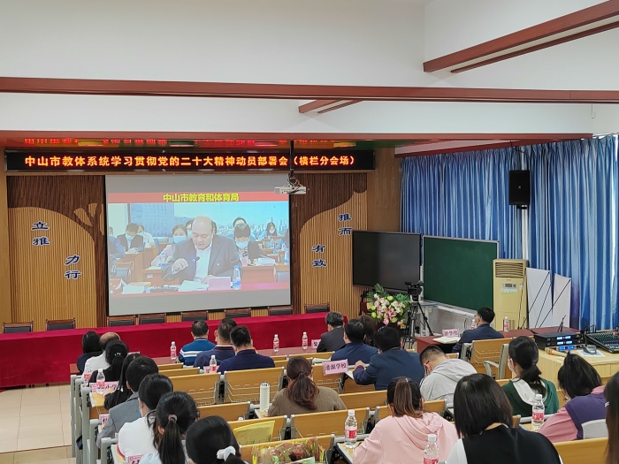 2022年11月4日上午,中山市教体系统学习贯彻党的二十大精神动员部署会在教体局召开。横栏镇教育系统党委班子成员、教育和体育事务中心有关同志、中小学校、幼儿园党组织班子成员集中横栏镇分会场(四沙小学)参加。