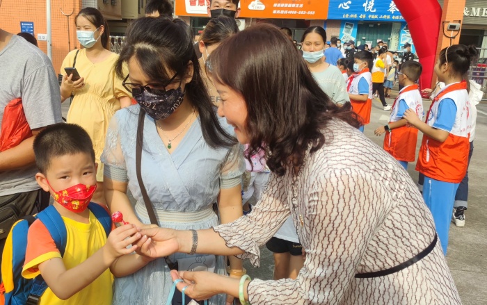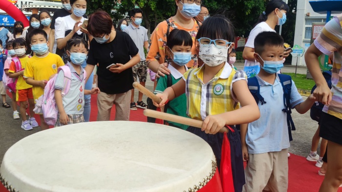 早上八点三十分,一年级新生和家长携手进入校门。学校行政老师和学生、家长志愿者们列队站在校道上礼貌地和每一个新同学打招呼,还为新生送上入校礼物——一根寓意着浓浓情意、满满鼓励的棒棒糖。孩子们收到礼物,笑逐颜开,一下子就消除了紧张的心情。新生迈步走过红地毯,先后完成学校精心布置的“朱砂点痣”“击鼓明志”“新生打卡拍照点”三个环节进入课室,全程仪式感满满。