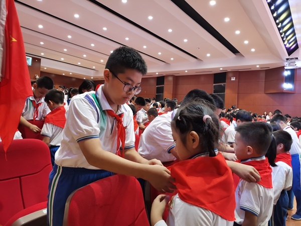 仪式进行到第十项,“准备着,为共产主义事业时刻准备着,”少先队辅导员领呼,少先队员们坚定地回应“时刻准备着!”声音响亮,胸前的红领巾越发鲜艳。