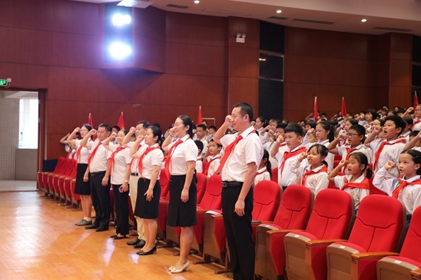 在嘹亮的进行曲中,护旗手们步伐整齐,高举队旗出场,场下同学们庄严肃立。队旗手步伐整齐,护送队旗出场。随后,同学们在指挥下齐声高唱队歌,嘹亮的歌声响彻大厅。音落,大队委宣读少先队组织决定、新队员名单,这意味着二年级的新同学从今天起,正式成为光荣的少先队队员。接着,由五年级少先队员为新队员佩戴象征身份红领巾,他们熟练的系结,标准地佩带。这鲜红的颜色,是国旗的一角,也是新老队员优良传统传播的纽带,系好红领巾,新老队员互敬队礼表示感谢。礼毕,大队长带领全体新少先队员进行宣誓,戴必俊副校长为新中队授旗,五个新中队将旗帜高高举起,接着,唐梅校长为给中队辅导员们颁发聘书。台上辅导员们表情喜悦,台下新队员们的眼睛在鲜红的队旗与胸前鲜亮红领巾的映衬之下,格外明亮。
