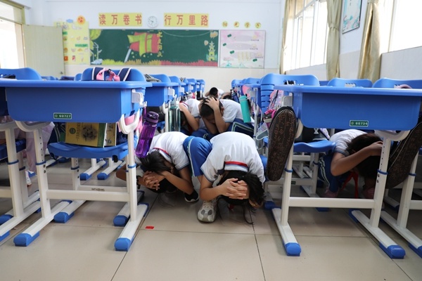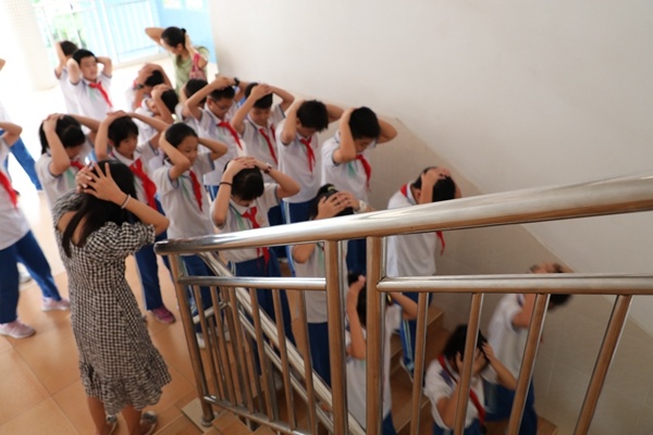 这次演练活动,全校师生给予了高度重视,前期的安全教育,演练的有条不紊,后期的总结提升,一切都按计划进行。上午9:30分,随着警报声在校园里急促响起,参演师生快速反应,躲进桌下,就近紧急避险,警报声结束,同学们在正副班主任的组织下,迅步走出课室,秩序井然地按指定路线快速疏散,各个楼层负责老师最后进行确认,保证没有一个学生滞留,全部学生在最快时间内疏散到指定的安全地点,班主任向场地负责人报告人数。