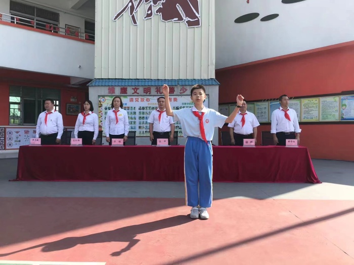 黄老师带领全体新队员在队旗下作了庄严宣誓。坚定而有力的宣誓声回荡在校园上空,为队员们崭新而又多彩的少先队生活吹响新的号角……
