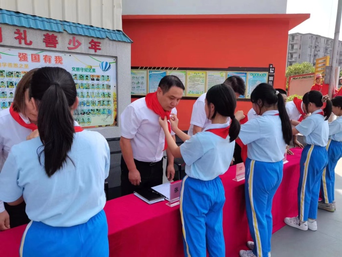 六(1)中队的覃祚海和六(2)中队的张梓清同学担任本次入队仪式的小主持人。少先队员代表为出席本次活动的领导嘉宾佩戴红领巾。