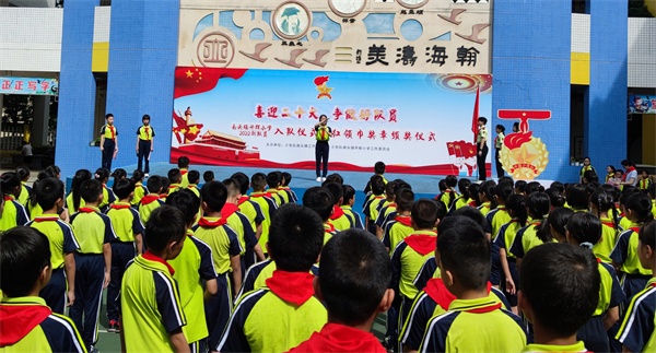 红领巾奖章是什么?红领巾奖章是少先队组织日常开展教育活动和评价激励的重要载体,分为基础章、特色章、星级章。在颁奖仪式上,南头镇升辉小学大队辅导员江婷婷老师组织全校师生学习并详细介绍“红领巾奖章”的设置,展示、讲解每一枚基础章和星级章的图形和寓意,并且解读了南头镇升辉小学红领巾争章方案。