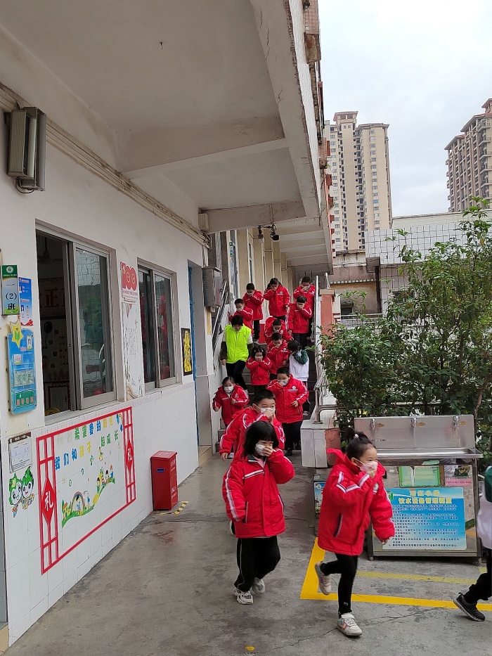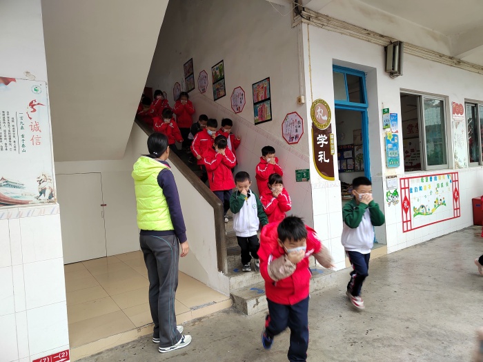 上午8:00分,根据学校安全疏散演练活动方案安排,学校广播发出通知:“现在发生火灾,请全体师生紧急疏散”,同时拉响了警报声,班主任或上课教师立即停止授课,学生在老师带领下有秩序从楼梯向下撤离,并按照《培红小学紧急疏散示意图》预定的疏散路线,迅速撤离到事先指定的地点整队。