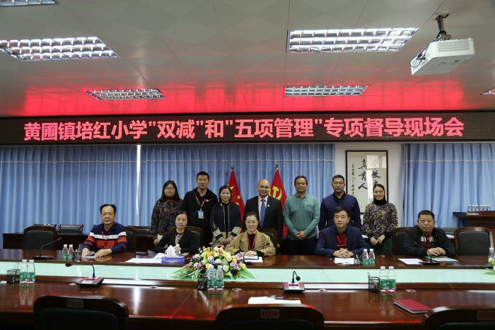 为进一步推动“五项管理”和“双减”等相关政策规定的落实落地,引导学校、家庭、社会树立科学育人理念,促进学生健康成长、全面发展。12月24日上午,中山市教育督导第一片区(南头与黄圃)联合督导组,莅临培红小学开展2021年义务教育学校“双减”和“五项管理”专项督导工作。参加本次督导工作的中山市督学南头镇教体中心教研员梁柳珍、张月音、升辉小学吕鉴添校长、黄圃镇教体中心何凤云书记、袁港喜副主任、姚劲强老师。培红小学梁惠鹏校长以及学校部分行政陪同参加。
