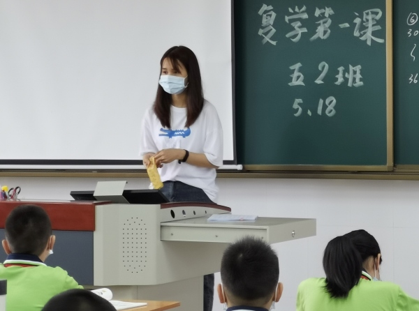 5月18日早上7点,教师们在梁德叶校长的带领下,到了各自的岗位,做好了迎接学生上学的准备。7点15分开始,四至六年级学生按照错峰上学安排,佩戴着口罩,保持安全距离,单列纵队,依次有序地从各自年级通道进入校园。入校后,学生们先在值日教师的指引下到洗手处用“七步洗手法”洗手,随后才进入各自的教室。班主任及时对学生进行晨检、查验复课证明等日常防护工作。教室里,学生佩戴着口罩,单人单桌,保持距离,一双双明亮的小眼睛里仍闪着充满求知欲的光芒。