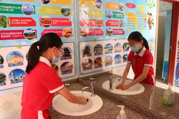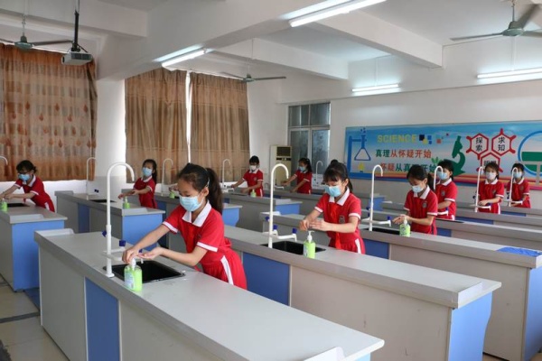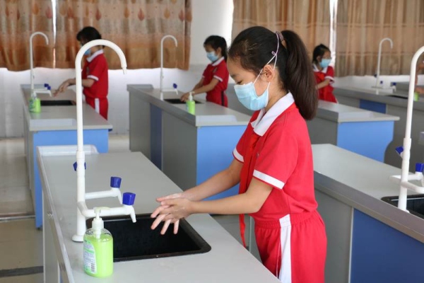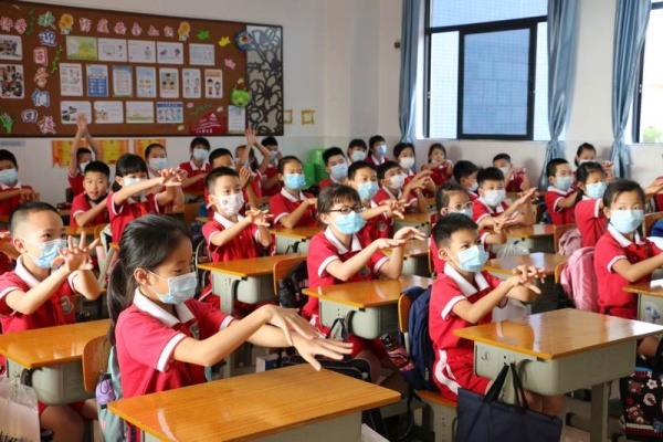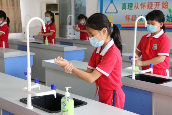 为进一步做实做细学生返校的各项准备工作,让全体师生进一步熟悉学生返校的工作流程。从5月19日开始,新地中心小学利用本周每天下午第三节对四五六年级进行洗手、出操、放学集队的常规训练 :首先是进行七步洗手法的训练。第一天分别是四(2)班在科学室前、五(2)班在洗手间、六(1)班在美术室前进行洗手法训练。各班在何建辉主任和正副班主任的指导下在指定地点的洗手池,同学们分批进行洗手训练,确保每个同学学会七步洗手法。五(1)五(3)五(4)六(2)六(3)在邓蛟龙主任和正副班主任和的带领下在操场进行集队出操的训练。四(1)、四(3)、四(4)在杜晗婷主任、林静主任以及正副班主任的带领下在小广场和校门口进行集队放学训练。