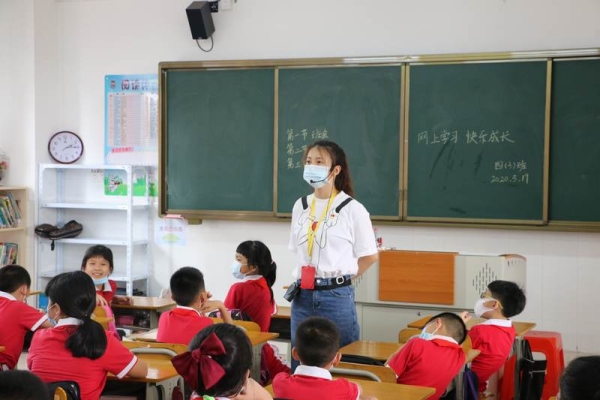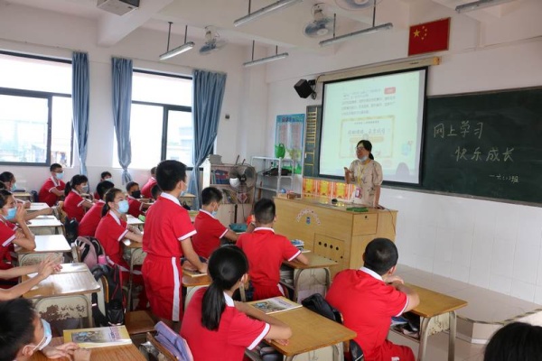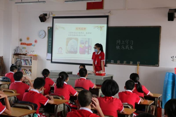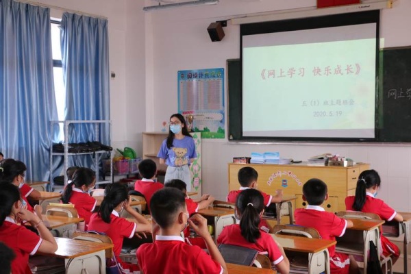 在班会课上,同学们先是回顾了两个多月以来网上学习的方式,同学们分享了自己的一些学习方法,有的同学在父母的督促下进行学习,有的同学是独自完成线上学习任务。接着,同学们分享了自己在网上学习过程中遇到的困难,有的同学是和兄弟姐妹共用一台网络学习终端,在学习上有一定的限制;有的同学是父母复工了,家中没有可以使用的学习终端,要等父母回来才可以进行网络学习;有的同学认为,网上学习和课堂学习区别很大,缺少和老师、同学的互动;有的同学认为,网上学习要经常对着电子产品,眼睛容易不舒服,要注意休息和做眼保健操……也有同学指出,线上学习有很多好处,学习视频可重复进行观看,可由自己安排适合自己的学习计划等。