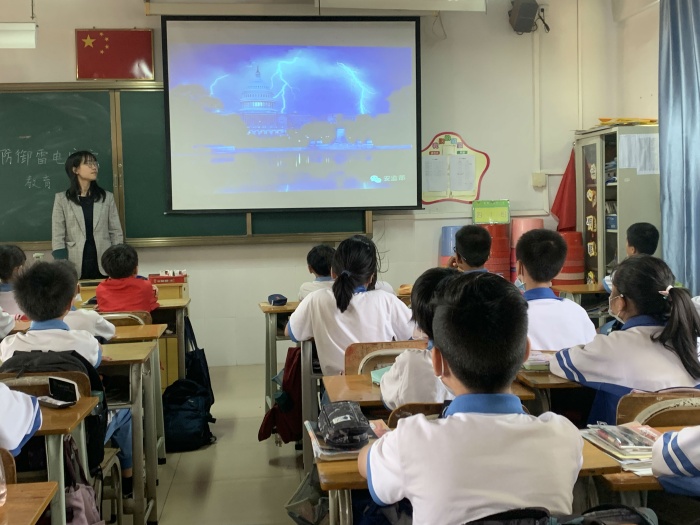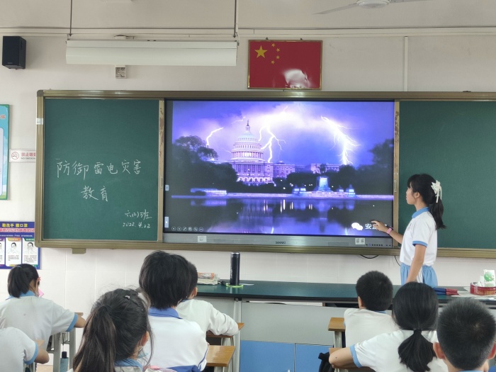 老师们针对雷电的产生、特点、预防措施等方面,向学生们深入浅出宣讲有关防雷电安全知识以及安全注意事项,还把夏季常见安全事故,利用多媒体课件呈现给学生。并且根据一些因恶劣天气、雷电等因素造成的惨剧对学生进行警醒教育,让学生真正在思想上受到触动。