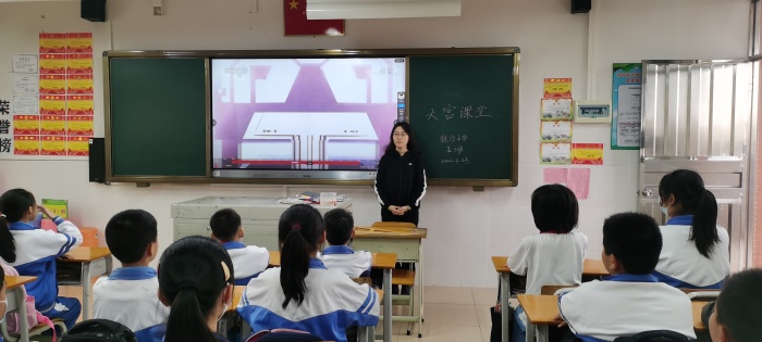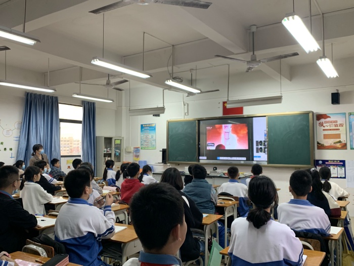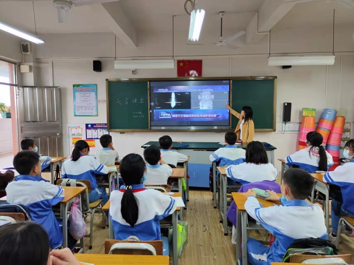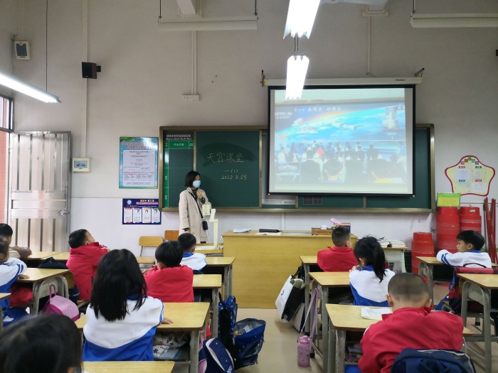 2022年3月23日下午,“天宫课堂”第二课在中国空间站开讲,神舟十三号乘组航天员翟志刚、王亚平、叶光富相互配合进行授课,中央广播电视总台面向全球进行现场直播。为了激发学生不断追求“科学梦”“航天梦”的热情,为了培养学生探索科学知识的兴趣,中山市黄圃镇新沙小学特地组织全校学生在课室内观看了当天的直播课。