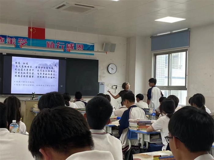 课题组成员罗平老师就《登高》一诗上了一堂展示课。本节课教学设计精巧,文本解读透彻,充分体现了诵读为主的教学方法,具有示范性。罗老师从《城南旧事》的小段风景视频导入,让学生初步体会到“景物也可以传情”的概念,接着以问题为线索激发学生对“杜甫”诗歌的学习兴趣,随着文本讲解的深入以及反复的诵读,学生深刻体会到杜甫在诗歌中体现的“常年漂泊、老病孤苦、国运艰难、壮志未酬”的悲情,理解了本诗“情景交融”写作手法的运用。《登高》从文本出发,层层深入,带着学生赏自然、历人生、悟哲思,最后通过学生熟悉的游戏角色,引出为“杜甫”进行画像的课堂作业,学生反应热烈,课堂也极具启发性和生成性。本次《登高》的公开展示课充分体现了罗老师扎实的教学基本功、巧妙的课堂驾驭能力和深厚的文本分析能力。