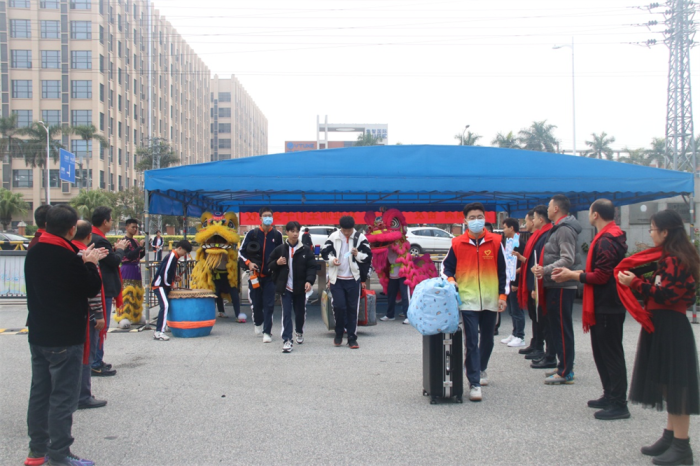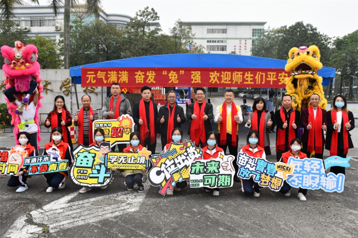 清晨,迎着和煦的春风,在欢快的锣鼓声中,中山市火炬科学技术学校醒狮队、教师代表在校门口热情地迎接着每一个学子,让同学们体验和感受民俗文化的同时,把健康、平安、喜乐带到校园的每个角落,寓意新学期学子们将在喜庆、吉祥的环境中开开心心地学习、健健康康地成长。学校领导、教师代表、“小火炬”志愿者等,一早到校迎接同学们返校,来回奔波搬运行李,只为给同学们加注一份安心、增添一抹暖意。默默守护的身影,是对孩子最好的言传身教。校长、教师代表将寄托着殷切希望的兔年贺卡亲手发给每一个同学。一声声问候,一句句欢迎,让刚迈入校园的学子们都沉浸在幸福、快乐的氛围中。