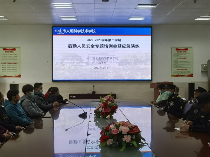2023年2月4日,为切实做好校园安全工作,保障师生安全顺利返校,中山市火炬科学技术学校总务处召开了校园安全工作会议、后勤人员安全培训会议和系列安全演练活动,为新学期教育教学工作的顺利开展打好坚实基础。出席活动的有学校党总支委员、副校长梁建雄同志,总务处主任陈百良同志,总务处副主任蔡飞翔同志,安全主管姚潮茂、刘光华同志及全体后勤人员。会议由陈百良同志主持。