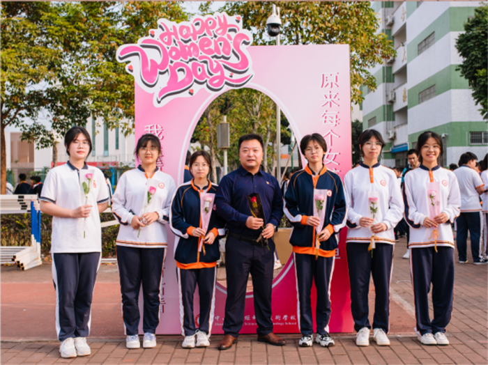 为积极庆祝3·8国际劳动妇女节的到来,丰富女生校园文化活动,引导广大女生关注自身综合素质的提升,展示女性风采,3月8日上午,中山市火炬科学技术学校两校区分别开展第二届“女生节”专题教育活动。学校党总支书记、校长陈建国同志带领校级领导班子、部门(处室)负责人、学部正副部长参加了此次活动,并为全校的女教师、女学生赠送鲜花,庆祝节日快乐。