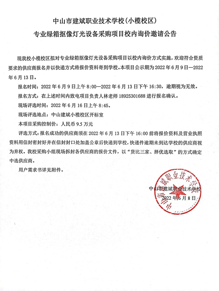 中山市建斌职业技术学校(小榄校区)专业绿箱抠像灯光设备采购项目校内询价邀请公告