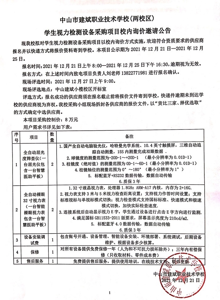 中山市建斌职业技术学校(两校区)学生视力检测设备采购项目校内询价邀请公告