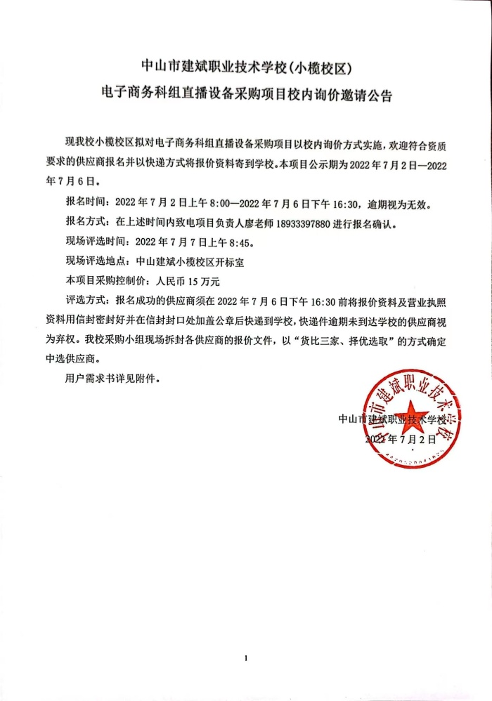中山市建斌职业技术学校(小榄校区)电子商务科组直播设备采购项目校内询价邀请公告