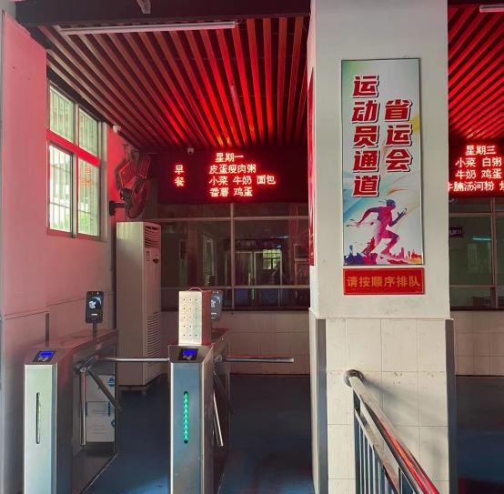 用餐时间,走进食堂,环境干净整洁,饭菜香味扑鼻而来。针对省运会比赛的学生,食堂设置了两条不同的通道:省运会运动员通道和普通通道。在省运会备战期间,所有学生的伙食餐标都有所提高,保证每天摄入足够的优质蛋白质、碳水化合物、膳食纤维等营养物质。其中,走省运会通道就餐的学生每天提供提供两次优质奶类,中午和晚上都有加餐,包括符合运动员需求的高糖高蛋白食物,确保参赛运动员有足够的营养支撑高强度的训练。由于参赛队员白天训练强度增加,有的队员需要增加体重或补充营养,在宵夜方面,食堂对省运会的参赛队员还提供了免费就餐服务。