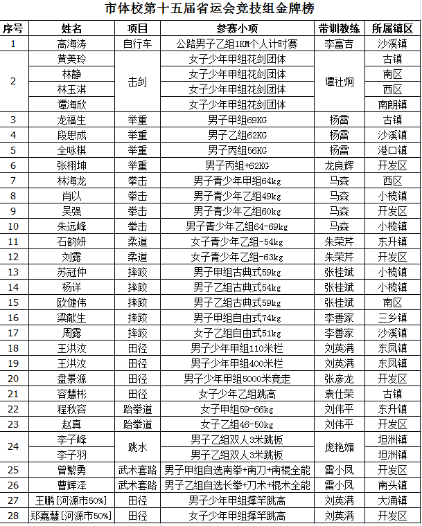 武术套路男甲自选南拳+南刀+南棍全能金牌:曾繁勇 带训教练:雷小凤 输送镇区:开发区