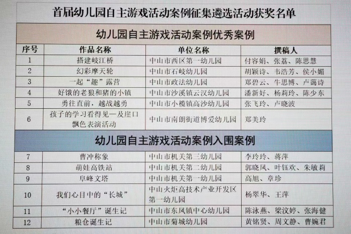 2023年5月5日,在广东省教育厅公布的《广东省首届幼儿园自主游戏活动案例和幼小衔接活动方案征集遴选结果》中,中山市有12个自主游戏活动案例和10个幼小衔接案例榜上有名。据了解,全省共遴选出自主游戏活动优秀案例86篇,入围案例138篇;幼小衔接活动优秀方案80篇,入围方案145篇。中山市此次选送自主游戏活动案例15个,其中6个获评优秀案例,6个获评入围案例;选送幼小衔接活动方案15个,其中6个获评优秀方案,4个获评入围方案(获奖名单见附件)。