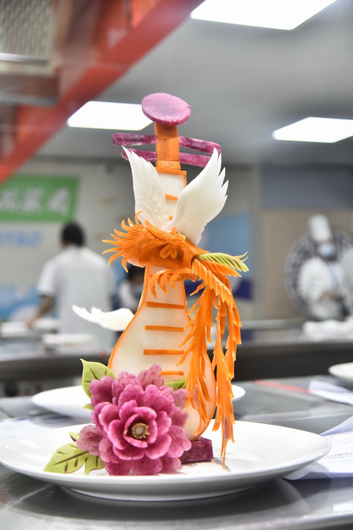 比赛凸显职教特色,为省内各中职学校之间专业建设提供交流与成果检验的平台。烹饪赛项由理论和实操两大项目组成,实操项目分为四个模块:粤菜制作、广点制作、主题拼盘和食品雕刻,主要考察选手对粤菜、广点基本功的知识和技能掌握程度。模块一:粤菜制作,参赛选手在 115 分钟内完成五彩炒鸡丝、骨香鸽片和自选作品制作;模块二:广点制作,参赛选手在 150分钟内完成提褶包、岭南酥皮作品(烤制)和自选作品的制作;模块三:主题拼盘制作,参赛选手在63分钟内完成剞切蓑衣黄瓜和自选作品的制作;模块四:食品雕刻,参赛选手需要在67 分钟完成基本功作品月季花和自选作品的制作。自选作品需符合地方粤菜饮食文化特色和烹饪技法特点,展示选手技术创新和学以致用方面的技巧与能力。