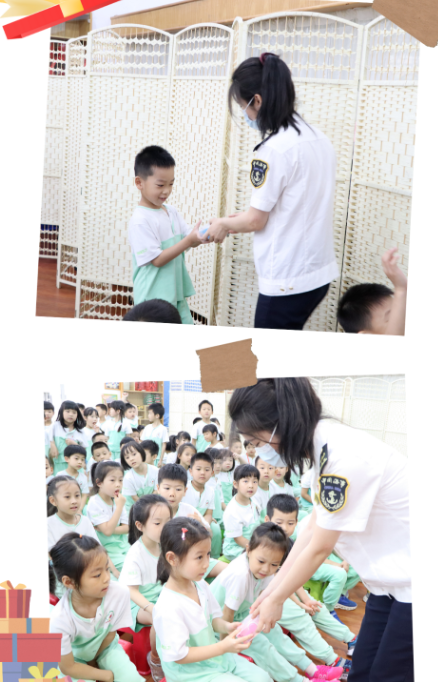 活动最后,中山海事局给幼儿园赠送《中山市水上安全应急手册》,让孩子们通过阅读了解更多的水上安全知识。作为感谢,孩子们也给叔叔、阿姨送上自制的海洋、船舶徽章。