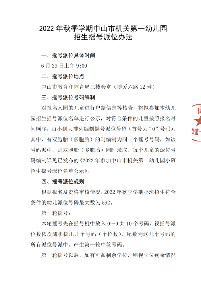 关于2022年秋季学期中山市机关第一幼儿园招生摇号派位办法的通告