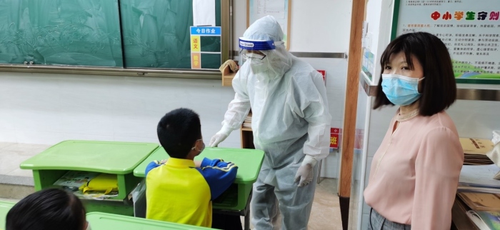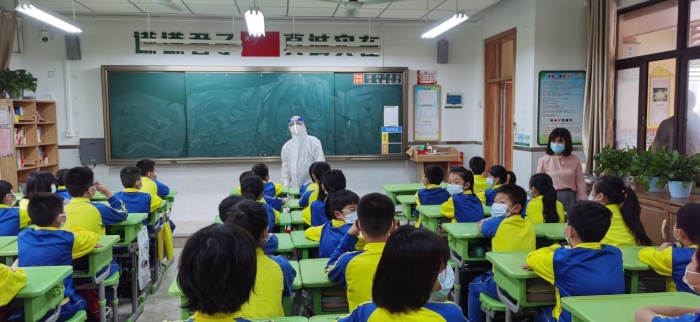 本次演练的内容主要分为三个方面:转运病例到留观室、封闭校园、班级原地防护,演练的场景内容是辖区卫生健康部门工作人员致电学校校长唐从彦,告知该校学生甲是新冠肺炎病例的密切接触者,经确认,学生为五(1)班学生,正在课室,班主任吴孔燕老师正在该班上课。