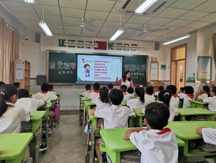 在主题班会上,中队辅导员带领队员们重温了7月1日上午在北京天安门广场隆重举行的庆祝中国共产党成立100周年大会的视频,“请党放心,强国有我!”是在这个大会上发出的青春誓言,响彻神州大地,这是“后浪”奔涌的时代潮音,是开创未来的青春担当。队员们聚精会神地观看着欢庆中国共产党百岁生日的盛大仪式,立志传承红色基因,树立强国梦想,增长本领才干。
