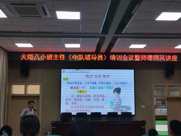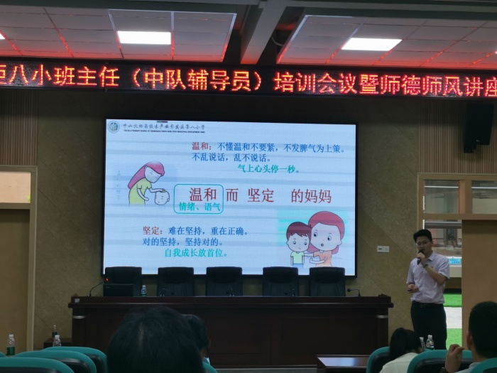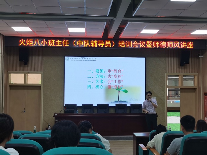 “师也者,教之以事而喻诸德也”,为加强班主任队伍建设,落实立德树人根本任务,建立良好的家校关系,家校共育,共促学生成长,火炬八小于8月28日下午在报告厅开展德育专题讲座暨班主任(中队辅导员)培训会议。本次会议由学生服务室邓龙主任主持,特邀请了中山市优秀德育干部、中山市班主任专业发展研究中心成员、中山市家校共育研究中心讲师团副团长、火炬区第四小学杨勇强副校长为全体班主任和新教师开展讲座。