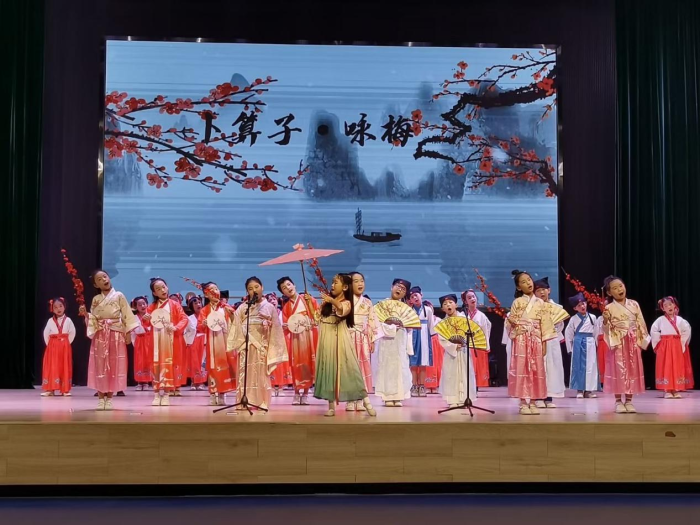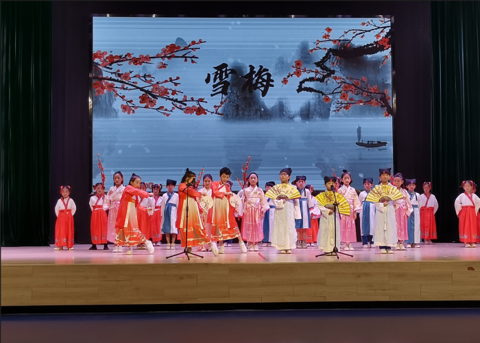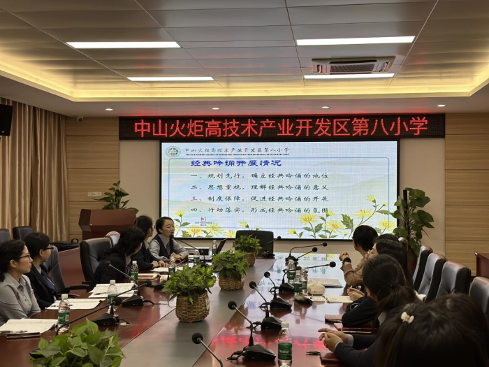 据学校语文科组长宋月红老师介绍,自2019年9月建校以来,语文科组积极引领学校语文老师认真学习《中华经典吟诵》读本、《吟诵艺术教程》等教学资源,结合学校梅兰竹菊的君子文化特色,开展吟诵知识培训讲座和各类丰富多样的吟诵教学研修活动,规范开展吟诵教学,探索高效的教学方法,通过每天课前吟诵、个人吟诵竞赛、亲子吟诵表演、组建吟诵社团、排演吟诵节目等等多样化方式,取得显著的教学成果,在八小校园构建起以中华文化精神为核心、以吟诵为基础、形式多样内容丰富的中华优秀传统文化底蕴。