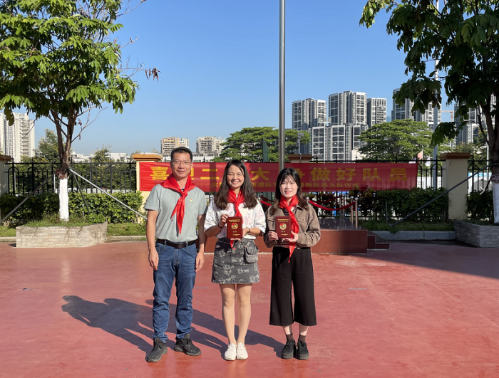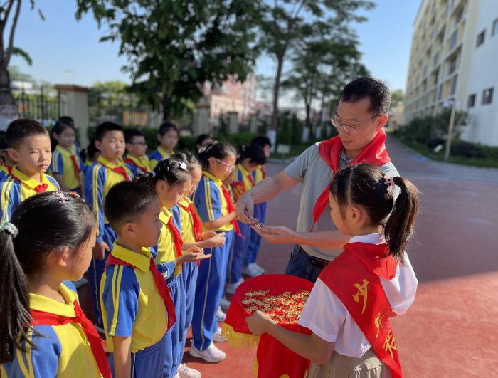 在入队仪式中,学校学生服务室邓龙主任为获得开发区2021-2022年度“红领巾奖章”二星章(集体)及二星章(个人)颁奖,据了解,原三5中队、三7中队获得本次区二星章(集体),中队辅导员李诗苑老师和杨燕妮老师代表班集体领奖;共有97名少先队员获得区二星章(个人)荣誉,同学们脸上洋溢着微笑,为自己所获荣誉感到骄傲且自豪。
