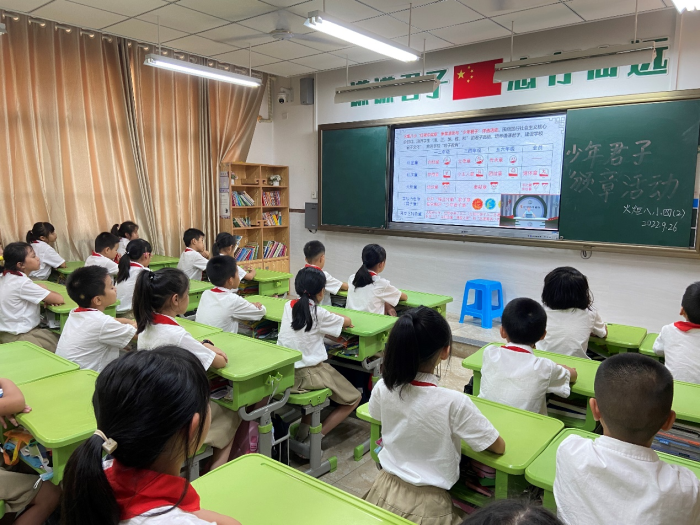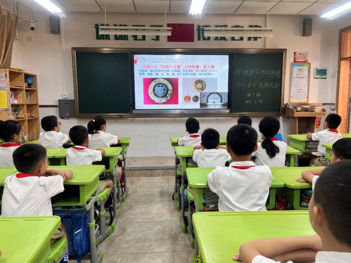 为深入贯彻落实习近平总书记关于少年儿童和少先队工作的重要指示精神,树立和增强少先队员光荣感和组织归属感,构建少先队阶梯式成长激励体系,火炬八小一直以来都积极开展“红领巾奖章”争章活动。9月26日下午,火炬八小借助学校红领巾电视台进行全校直播,举行“学做君子,你我能行”红领巾争章行动第四批“少年君子”表彰大会,由学生服务室邓龙主任主持本次大会。