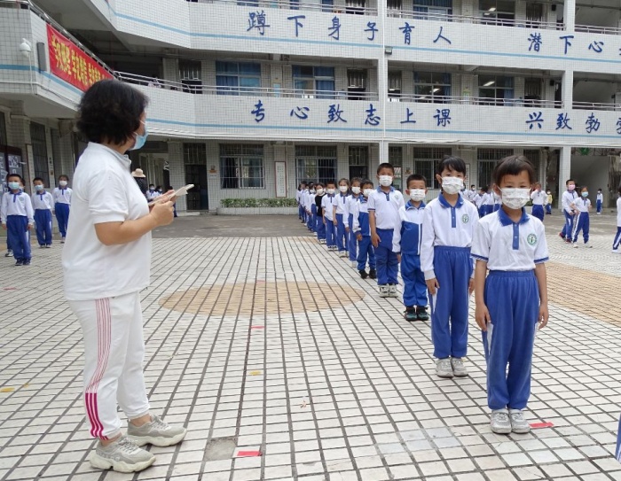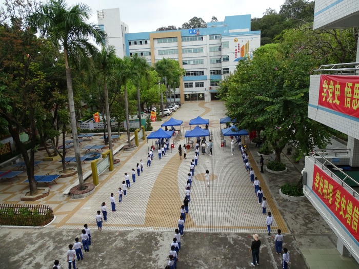 接到通知后,班主任马上做好班级学生信息的统计摸排工作,收集学生葵花码,并提前按序预演,按序排列受检队伍。党员教师志愿者提前在校内设置核酸检测采样点,布置场地、做好消毒,后勤人员张贴指示路线,各部门之间有序协调,密切配合。