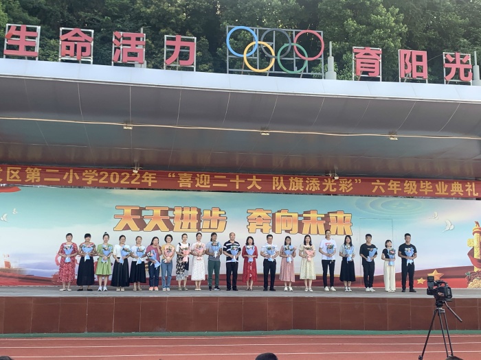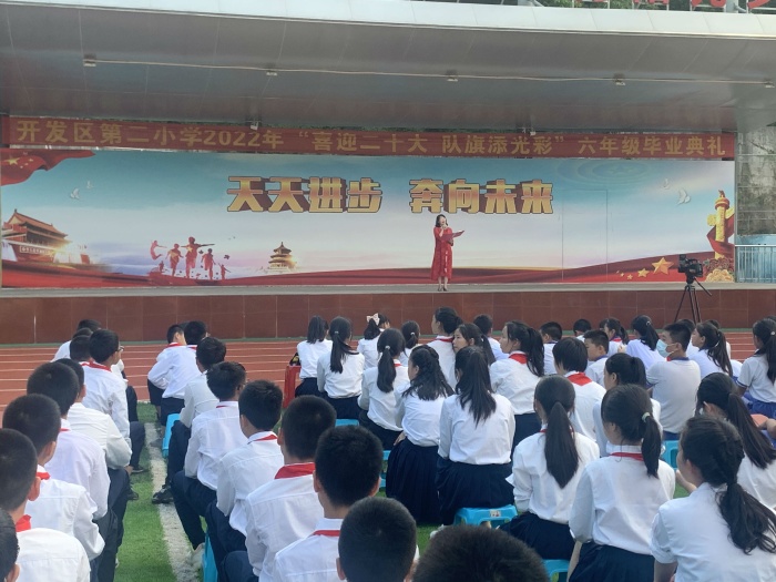 伴随着骄阳似火的盛夏,一年一度的毕业季悄然已至。2022年6月23日下午,开发区第二小学“喜迎二十大 队旗添光彩”六年级毕业典礼在学校操场拉开帷幕。周瑞珍校长、郑康乐副校长、黄桂芬副主任以及六年级全体任课老师出席本次毕业典礼。