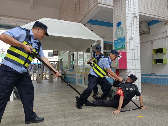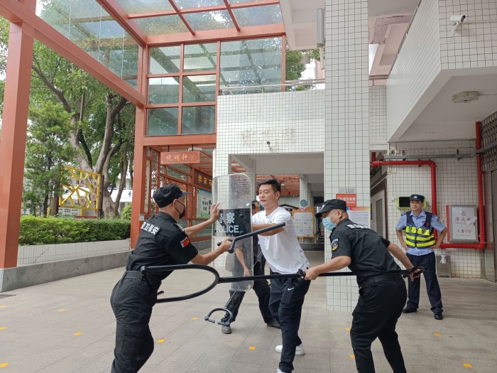 活动中,蔡成文警官带领队员们展示了“最小应急单元技能”基本要领,并在操作技能上作出详细且专业的讲解,其中重点教授了叉、盾、棍的组合应用,了解如何尽最大化地保护自己、制服施暴人。蔡警官还专门展示了棍法的打、扫、挑、挡的基本站姿与手法。保安处、护校队纷纷表示学到了重要、实用的安全技能知识,大大提高了处理应急安全问题的技能与效率。最后,护校队全体成员及保安处分别在蔡成文警官的指导下专业地进行了“最小应急单元技能”的模拟演练。