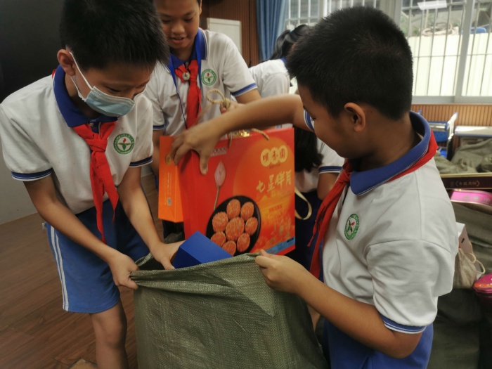 活动结束后,在少先队大队辅导员陈一蕾老师的组织下,少先队队干们把收集到的月饼盒、废旧电池、电子废品整理分装包扎好,等待回收人员的回收。