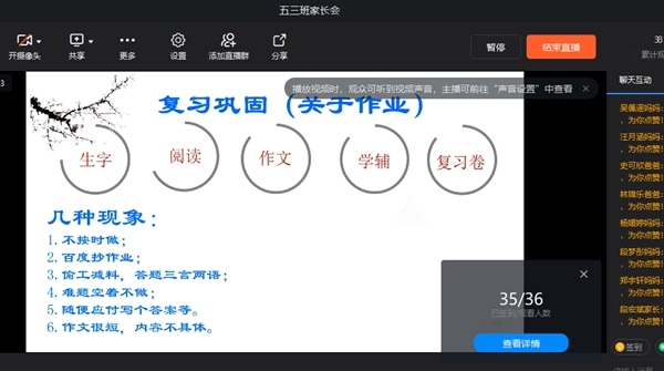 为使本次家长会能顺利的召开,三小会前召开了班主任会议。会议就时间安排、内容程序一一进行了布置。同时,德育处蓝佩贤主任给班主任们进行了线上直播培训,使班主任掌握相应的技能,为开展线上家长会做了充分的准备。