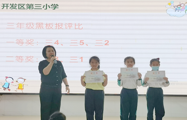 最后,蓝佩贤主任对本学期开展的运动会、学雷锋活动、防震演练、艺术节海选等活动进行总结,肯定同学们开学以来的表现,并给板报评比、班级文化评比、“红领巾奖章”争章活动获奖班级和个人颁发了奖状,获奖的同学和班级都开心不已,台下响起雷鸣般的掌声。
