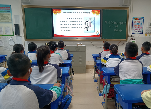 各班从爱国意识、文明意识、诚信意识、友善意识几个方面,阐释了当代中小学生应当具备的核心价值观。结合生活实际,师生共同探讨了“校园中存在的不文明现象、怎么样才能做到文明?”等问题,让社会主义核心价值观的真正意义在孩子心中得以内化。