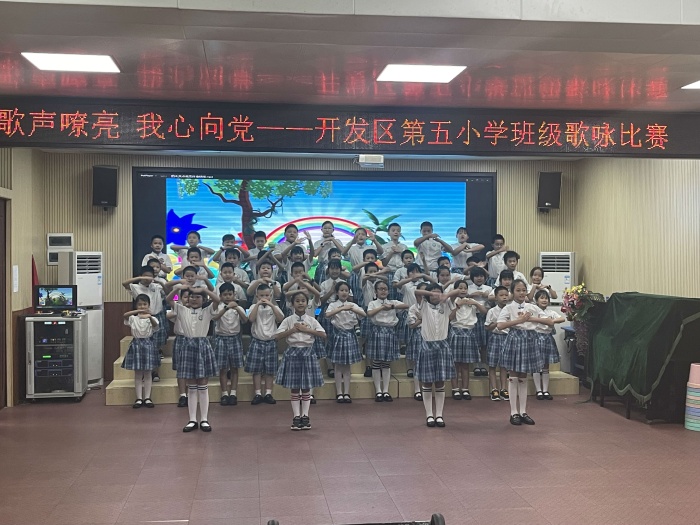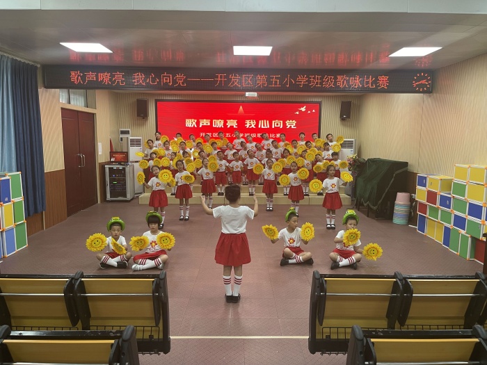 为喜迎党的二十大顺利召开,用歌声向伟大的党、伟大的祖国献上最诚挚的赞美和祝福。开发区第五小学于2022年6月9日-10日开展了以“歌声嘹亮 我心向党”为主题的班级歌咏比赛。 本次比赛以班级为单位,采用班级分散录制,评委线上观看打分形式开展。纵然本次比赛的现场没有观众和评委,但各班级的热情依旧高涨。