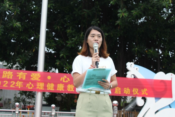 随后,大队辅导员阮结连老师作讲话。她向同学们强调了心理健康的重要性,并希望通过本次心理活动月一系列活动,每个学生都能关注自身心理健康,提高心理免疫力,积极调整自己的状态,学会及时寻求他人的帮助,乐观向上地学习与生活,“疫”路有爱,心向阳光。