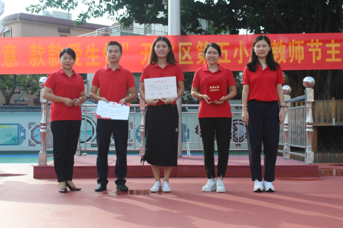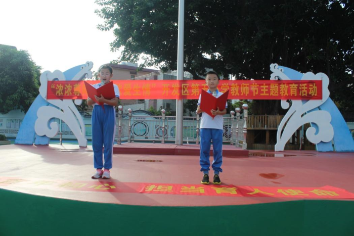 金秋九月,硕果飘香。为了庆祝第37个教师节,弘扬中华民族传统美德,营造全校尊师重教、尊师爱生的浓厚氛围,9月10日上午,开发区第五小学全校师生在操场开展以“浓浓尊师意,款款爱生情”为主题的教育活动。